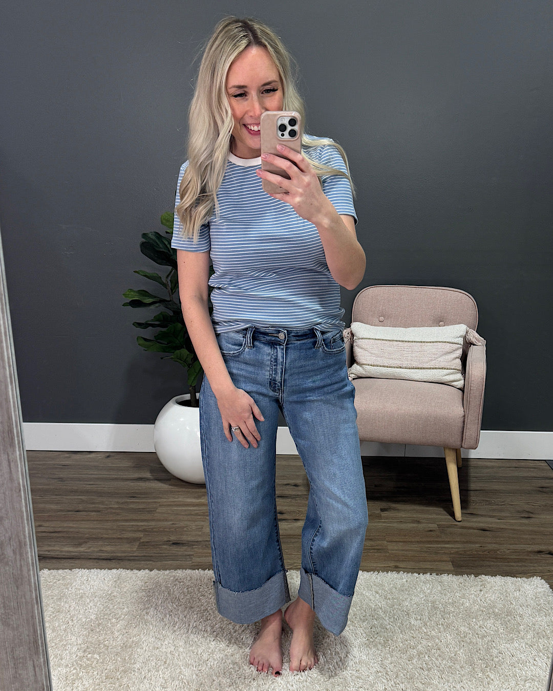 Alyssa is 5'5" and wears a size 25 in jeans, a small in bottoms and a small in tops.