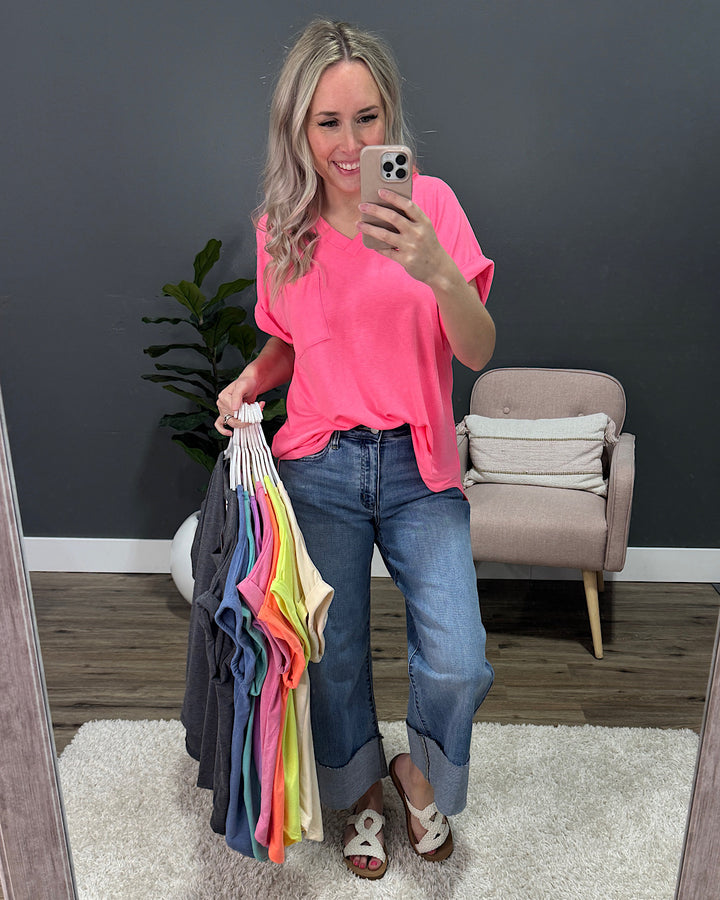 Girlfriend V Neck Roll Sleeve Pocket Top - Neon Orange Sew In Love