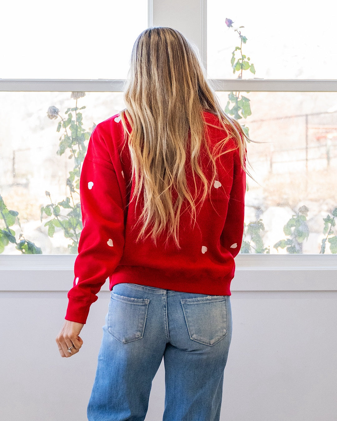 NEW! Heart Embroidered Fleece Crewneck Sweatshirt - Red