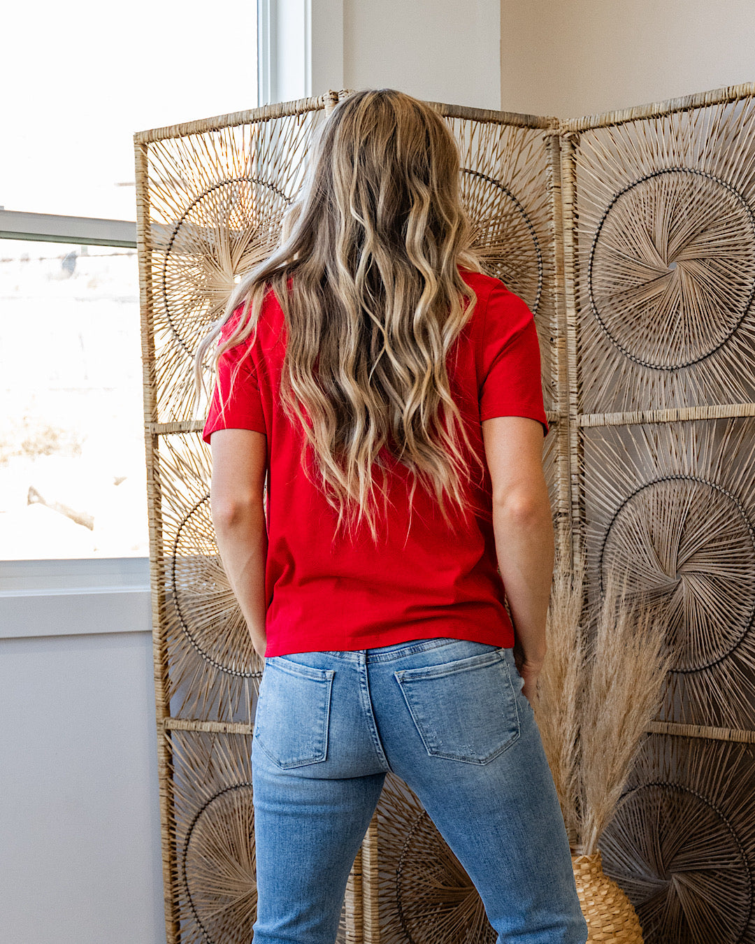 Courtney is 5'6" and wears a size 25 in jeans, a small in bottoms and a small in tops.