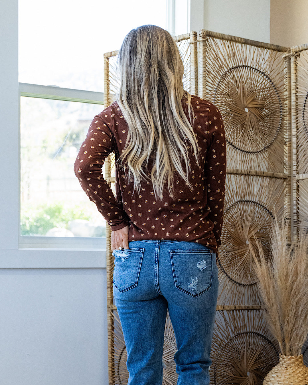 Saylor Ribbed Floral V Neck Top - Brown