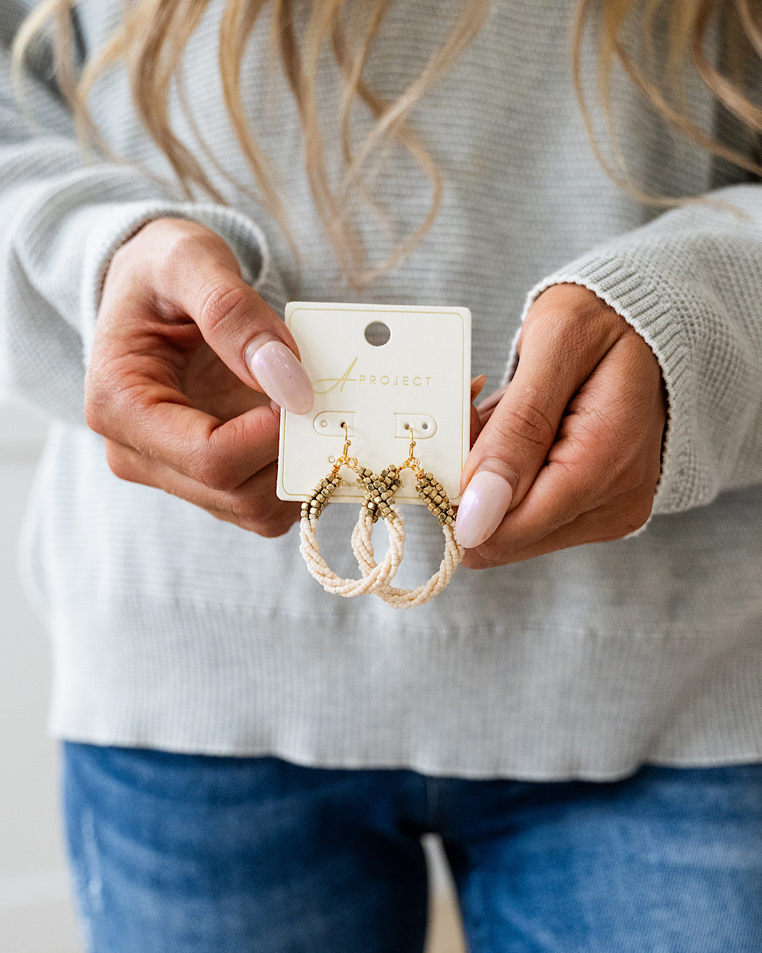 Gold and beige twisted beaded teardrop dangle earrings - 1.5"
