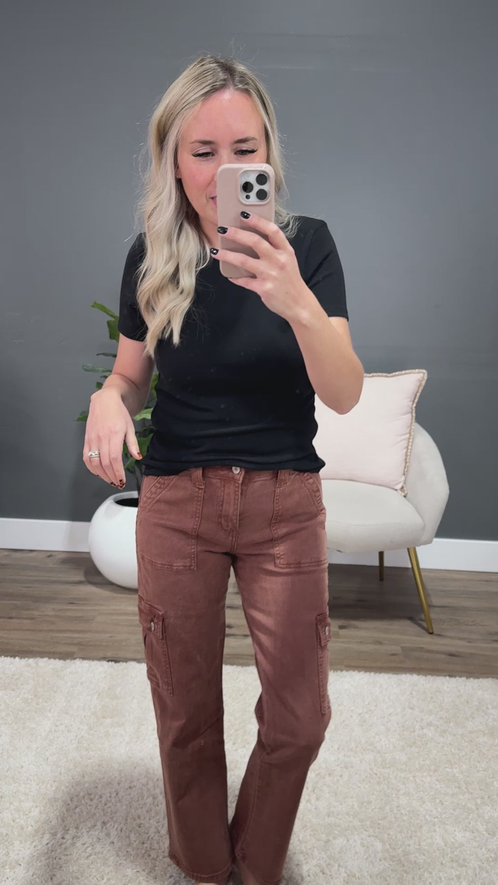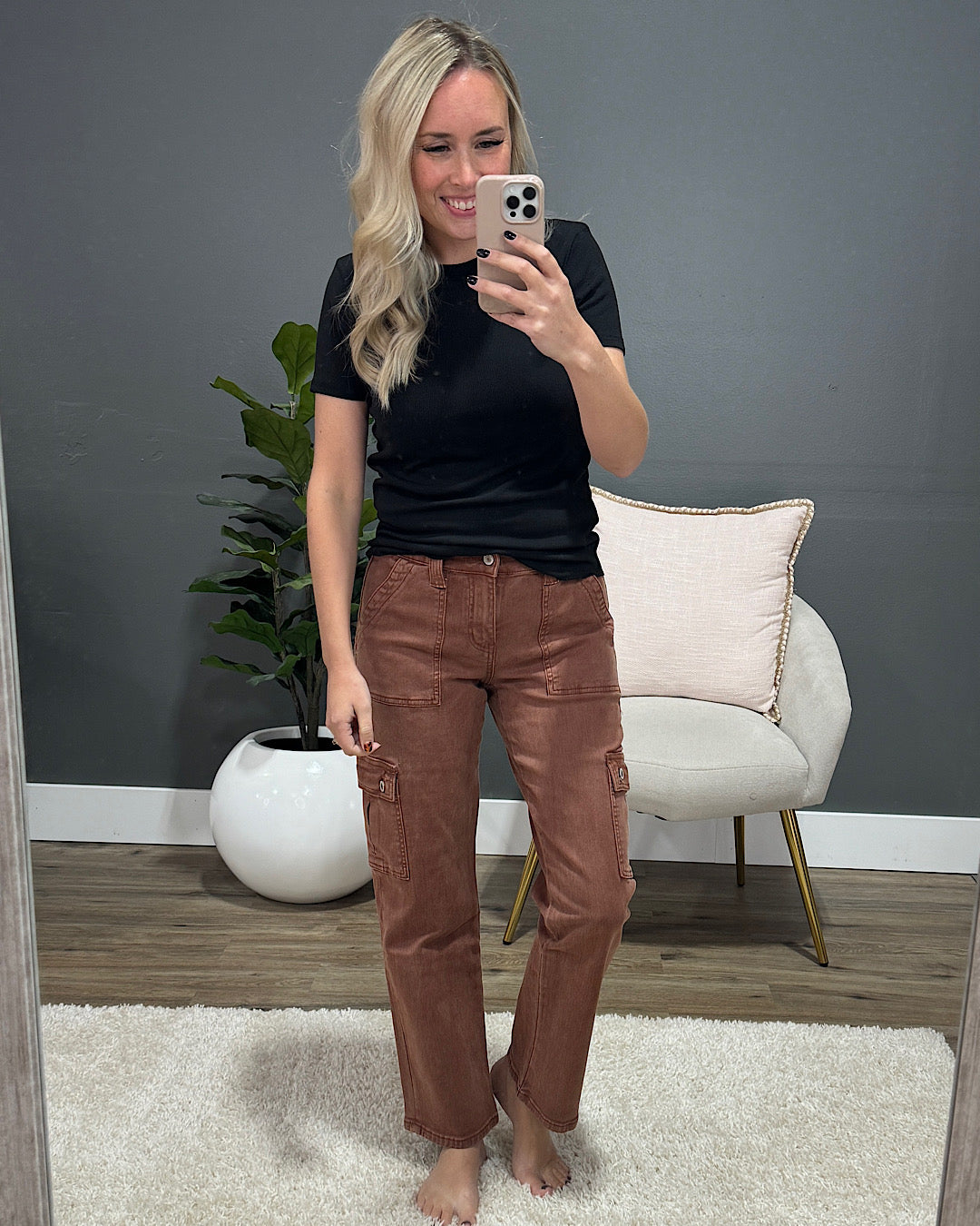 Alyssa is 5'5" and wears a size 25 in jeans, a small in bottoms and a small in tops.