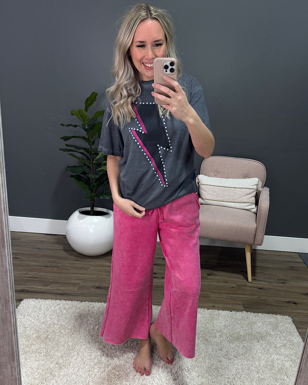 Alyssa is 5'5" and wears a size 25 in jeans, a small in bottoms and a small in tops.
