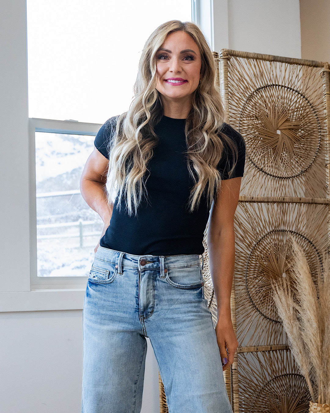 Courtney is 5'6" and wears a size 25 in jeans, a small in bottoms and a small in tops.