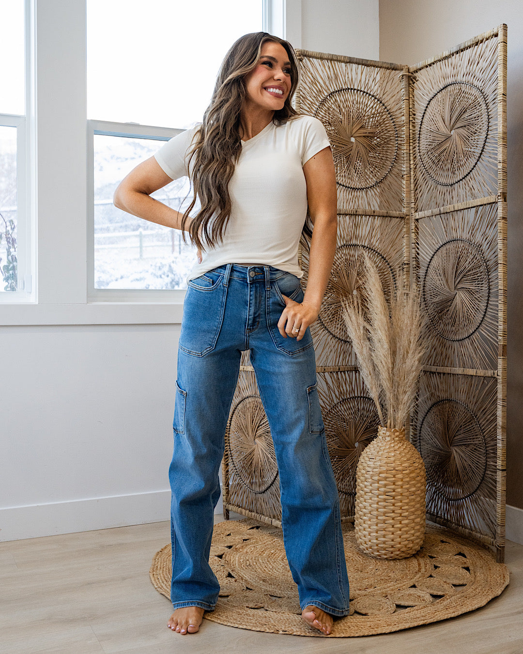 Alyssa is 5'5" and wears a size 25 in jeans, a small in bottoms and a small in tops.