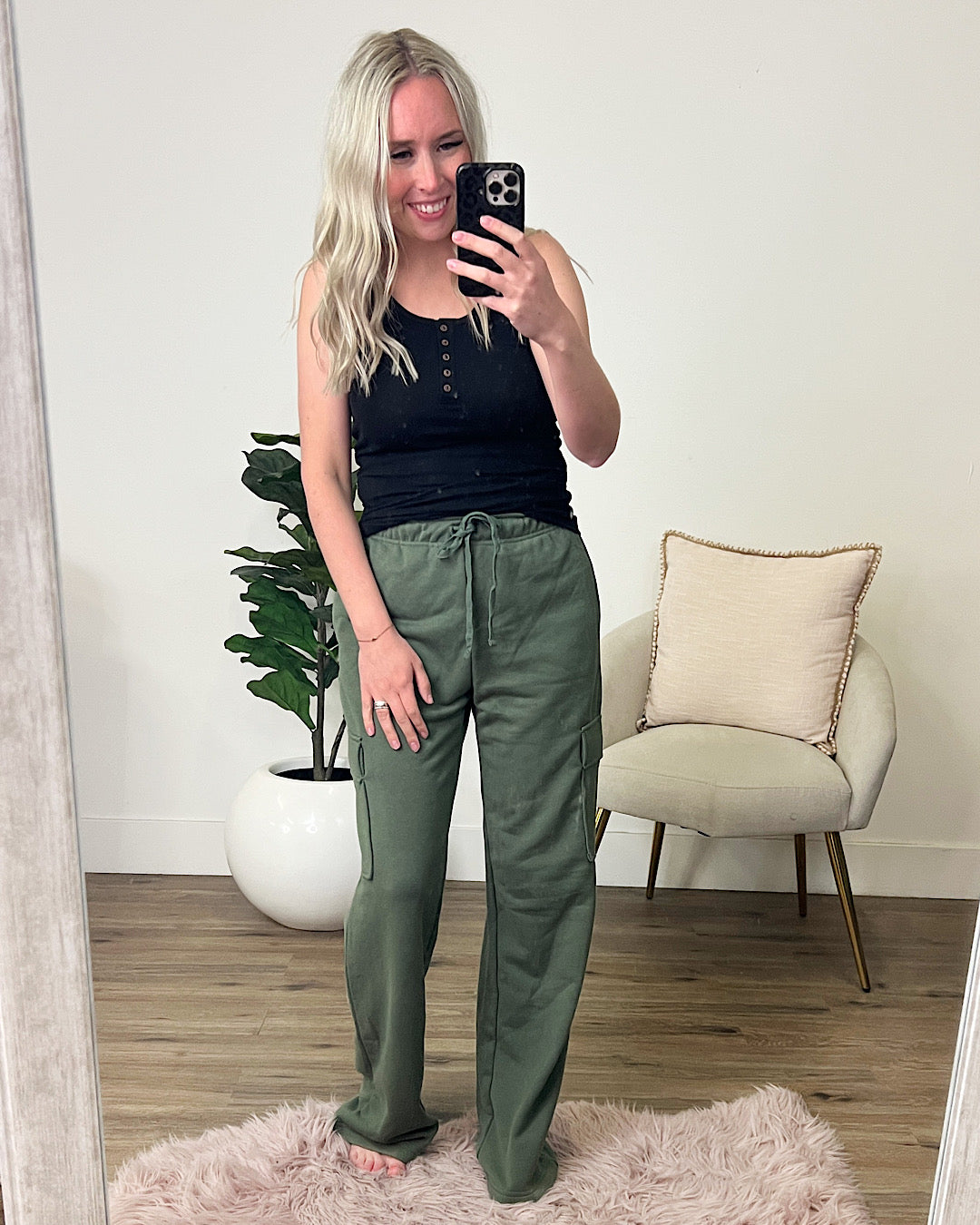 Alyssa is 5'5" and wears a size 25 in jeans, a small in bottoms and a small in tops.
