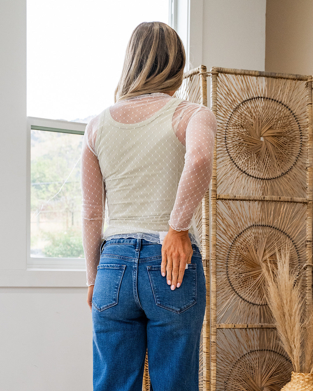 Courtney is 5'6" and wears a size 25 in jeans, a small in bottoms and a small in tops.