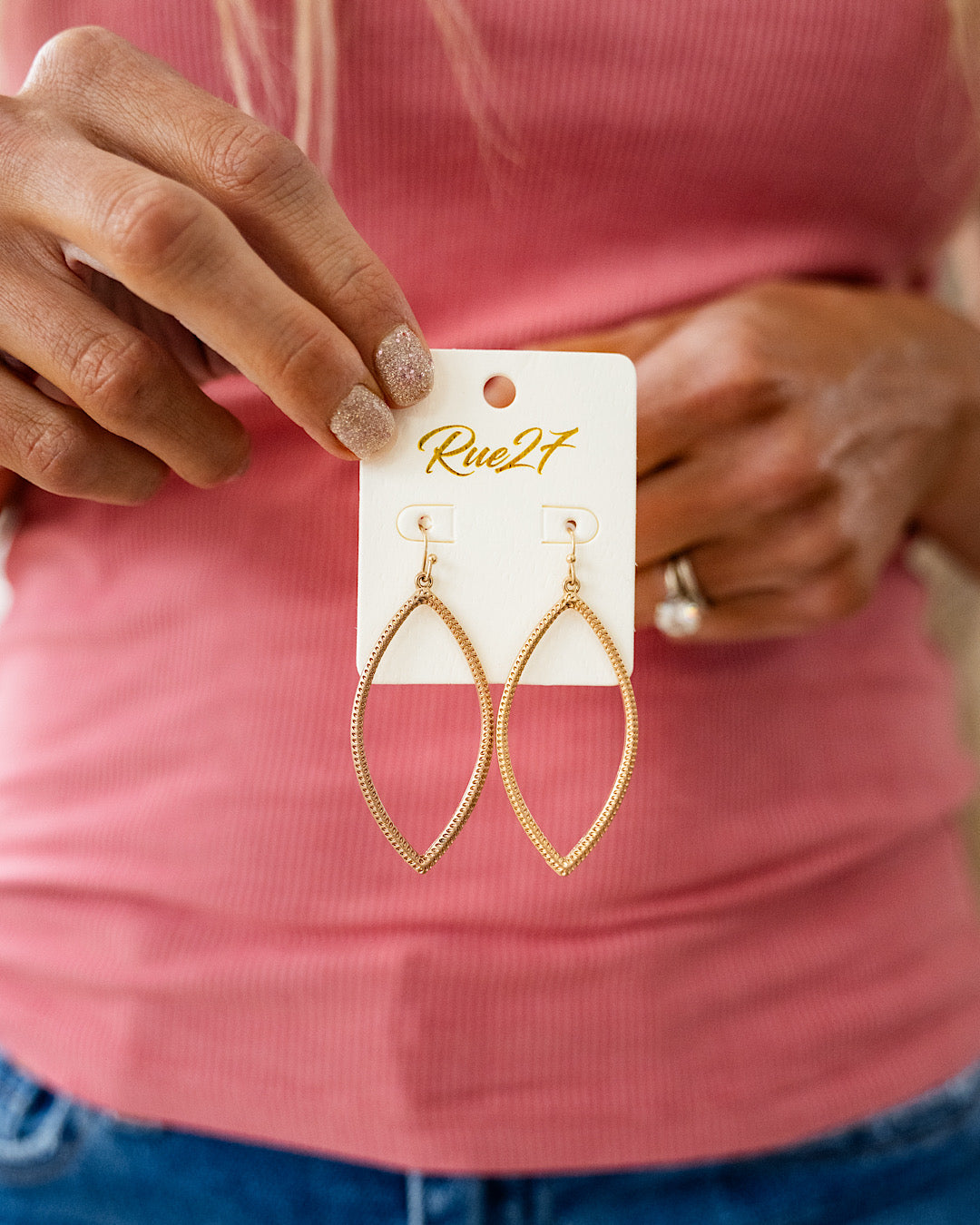 Gold textured metal marquise shaped dangle earrings